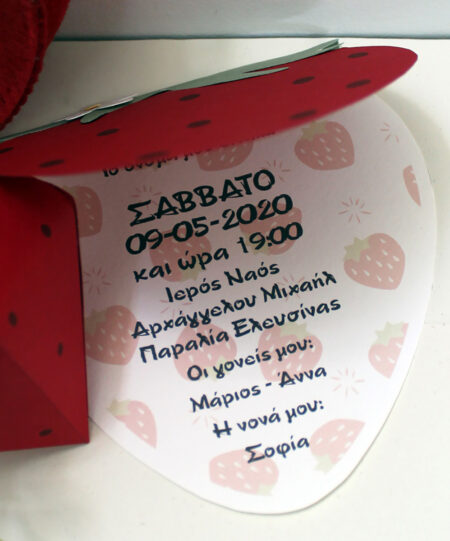 Προσκλητήριο σε σχήμα φράουλας! Υλικά: Χαρτί Διαστάσεις: 14,5×13 εκατοστά