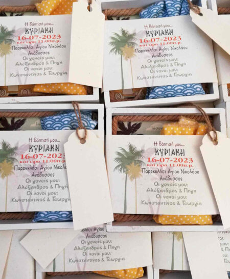 320.00 €Χειροποίητα βαπτιστικά πακέτα ζωγραφισμένα στο χέρι σε πρωτότυπα σχέδια!! Πακέτα 5 τεμαχίων: Βαλίτσα με ξύλινη χειροποίητη καλοκαιρινή διακόσμηση! Βαπτιστική λαμπάδα με ξύλινο καδράκι στο θέμα Σετ λαδόπανα λευκά Σετ λαδιού – 3 Κεράκια κολυμπήθρας – Μπουκαλάκι λαδιού – Σαπουνάκι *Τα πακέτα νονού χρειάζονται 15 εργάσιμες για να ετοιμαστούν για […]