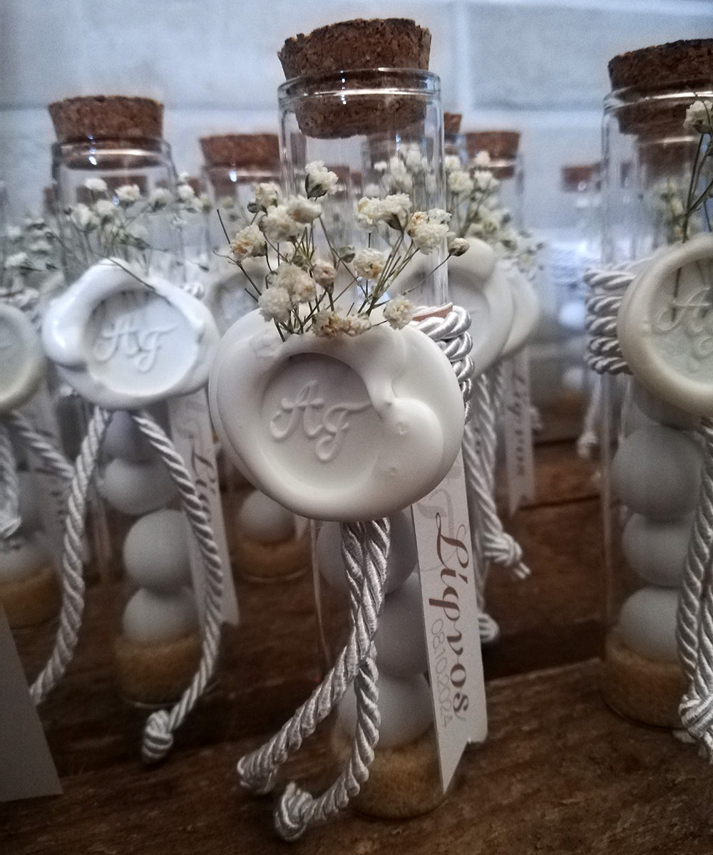 Μπομπονιέρα σε δοκιμαστικό σωλήνα με αποξεραμένα λουλούδια, προσωποποιημένη σφραγίδα βουλοκέρι και καστανή ζάχαρη!